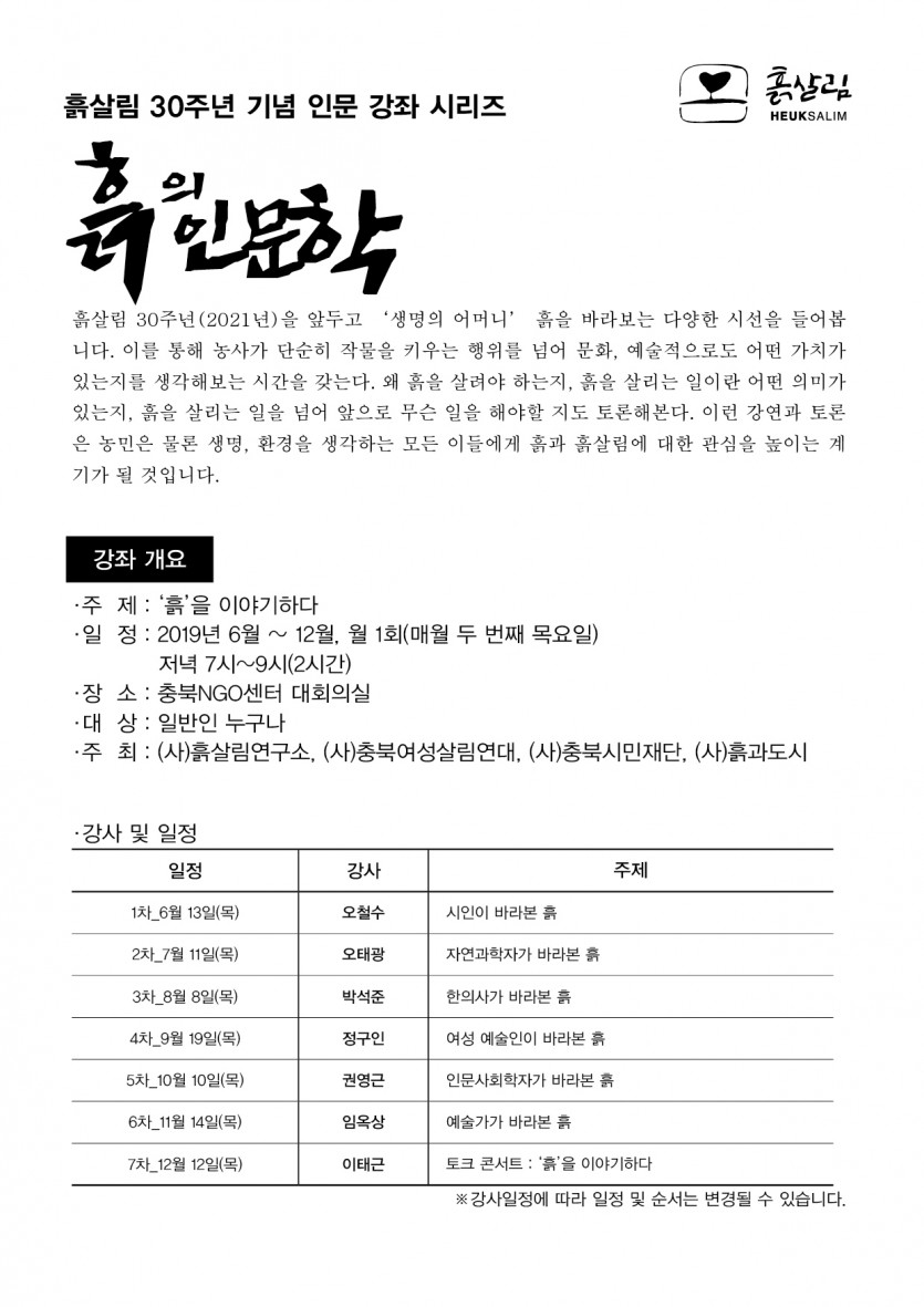 이번 흙의 인문학 강좌는 2021년 30주년을 맞는 흙살림이 이를 기념하기 위해 기획한 것으로, ‘흙과 생명과 환경을 살린다’는 창립의 뜻을 많은 사람들과 함께 나누는 자리가 되기를 희망하고 있다. 이번 강좌는 흙살림을 비롯해 (사)충북여성살림연대, (사)충북시민연대, (사)흙과 도시가 공동 주최한다.