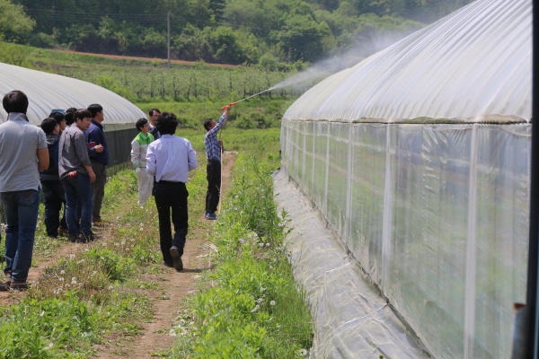 2015년 5월 8일 흙살림 토종연구소 농장에서 온실용 차광제 살포 시연회가 열렸다.