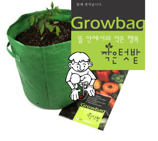 천막천을 이용한 환경친화적인 포대형 텃밭상자. 작은텃밭 1포대를 넣어 농사지을 수 있도록 만들어진 아주 간편한 텃밭용기다. 청주의 사회적기업에서 제작된다. 흙살림 작은텃밭과 단짝. 스티로폼이나 플라스틱보다 환경에 주는 부담이 적다. 아이들이 그림놀이를 하게 해서 화분을 만들어 놓는 것은 재미있는 tip!