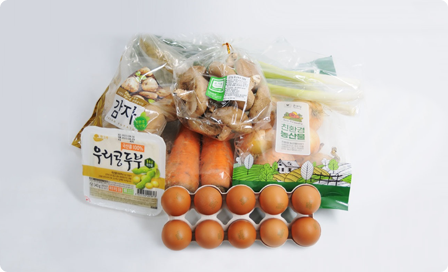 3~4인 가족이 먹기 적당한 분량으로 유기,무농약 채소를 중심으로 방사유정란이나 두부 같이 가정에서 흔히 먹는 식재료도 들어갑니다.
